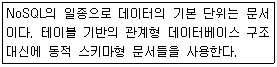이유는 그림에서 볼 수 있듯이 데이터를 저장할 때 테이블이 아닌 컬렉션(Collection)으로 저장하며, 이 컬렉션은 문서(Document) 형태로 저장됩니다. 또한, MongoDB는 NoSQL 데이터베이스로서 스키마가 없어 자유롭게 데이터를 저장하고 조회할 수 있습니다. 이러한 특징으로 인해 MongoDB는 대용량 데이터 처리와 분산 처리에 적합한 데이터베이스입니다.