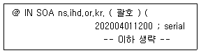 [네트워크 및 서비스의 활용] 다음은 zone 파일에서 메일 서버를 설정하는 과정이다. 도메인이 ihd.or.kr이고, 관리자 계정이 kaituser일 때 ( 괄호 ) 안에 들어갈 내용으로 알맞은 것은?