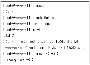 - ㉠ : 0022 : 파일 권한을 나타내는 숫자로, 0은 파일 유형을 나타내는데 사용되며, 022는 소유자는 모든 권한을 가지고, 그룹과 다른 사용자는 읽기와 실행 권한만 가지는 것을 나타냅니다.