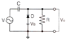 다음 회로에 정현파가 입력될 때 출력 파형으로 맞는 것은? (단, VB는 정현파의 진폭보다 크며, 다이오드는 이상적인 다이오드라고 가정한다.)