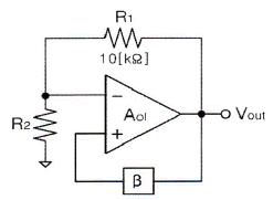 다음 그림은 윈 브리지 발진기의 블록도이다. 발진하기 위한 저항 R2의 값은?