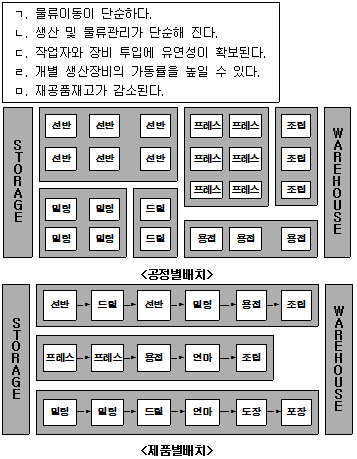 공장에서 생산라인을 설계할 때 사용하는 대표적인 설비배치 개념은 유사한 공정 설비를 모아놓는 공정별배치(Process Layout)와 제품이 생산되는 공정순서대로 설비를 배치하는 제품별배치(Product Layout)로 분류된다. 다음 보기는 공정별 배치와 제품별배치의 장점을 나열한 것이다. 올바르게 구분된 것은?