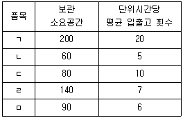 각 품목의 입출고 비용은 입출고 횟수에만 비례하고, 1회당 입출고량과는 상관없다. 창고의 입구와 출구는 동일한 곳에 위치하며, 품목별로 보관 위치를 지정하여(dedicated) 사용한다. 단위시간당 전체 입출고에 필요한 총 이동거리를 최소화하기 위해 입ㆍ출구에서 가장 가까운 위치에 배치하여야 할 품목은?