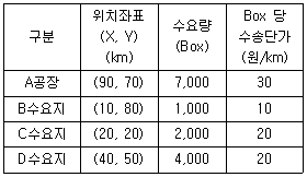 따라서, 각 지점의 위치와 수요량을 곱한 값을 구하면 다음과 같다.