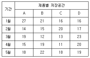 4가지 제품을 보관하는 창고의 기간별 저장소요공간이 다음 표와 같을 때, (ㄱ)임의위치저장(Randomized Storage)방식과 (ㄴ)지정위치저장(Dedicated Storage)방식으로 각각 산정된 창고의 저장소요공간은?