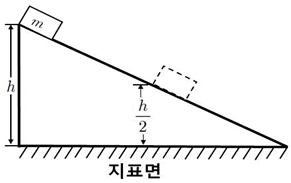 [자연과학개론] 경사진 면을 질량 m인 물체가 마찰없이 미끄러져 내려오고 있다. 물체는 높이 h에서 정지 상태로부터 출발하였다. 물체가 h/2인 지점을 통과하는 순간의 속력은?