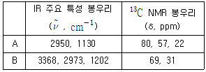 [자연과학개론] 표는 화학식이 C4H10O인 두 이성질체 A와 B의 적외선(IR)과 13C 핵자기 공명(NMR) 분광학 자료이다.