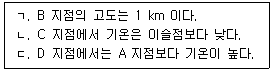 - 건조단열감률은 10℃/km이므로, A 지점에서 D 지점까지의 공기 덩어리는 3 km 상승하면서 기온이 18 - 30 = -12℃로 떨어진다.