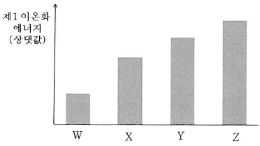 [자연과학개론] 그림은 원자 W~Z의 제 1 이온화 에너지(상댓값)를 나타낸 것이다. W~Z는 C, N, F, Na 중 하나이다.