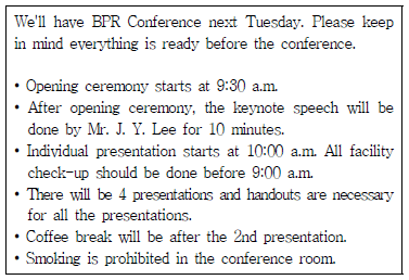 - ④ 발표에 필요한 기자재 확인은 9시 전에 마쳐야 한다.
