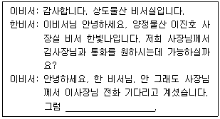 다음은 상도물산 김영수 사장의 비서인 이보영 비서의 전화응대 내용이다. 아래의 빈 칸에 들어갈 표현으로 가장 적절한 것은?