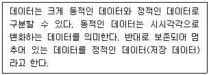 다음은 데이터의 종류에 대한 설명이다. 다음 설명을 읽고 보기에서 다른 데이터와 종류가 다른 데이터를 선택하시오.