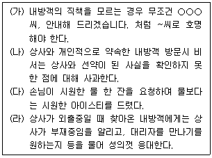 비서의 내방객 응대 자세 중 적절하지 않은 것만으로 짝지어진 것을 고르시오.