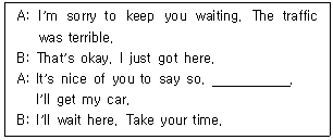 다음 대화에서 밑줄에 들어갈 수 있는 문장 중 가장 적절하지 않은 것은?