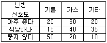 [사회통계] 가정 난방의 선호도와 방법에 대한 분할표가 다음과 같다. “가스난방”이 “아주 좋다”에 응답한 셀의 기대도수를 구하면?