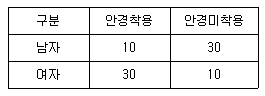 [사회통계] 다음은 성별과 안경착용 여부를 조사하여 요약한 자료이다. 두 변수의 독립성을 검정하기 위한 카이제곱 통계량의 값은?