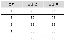 [사회통계] 5명의 흡연자를 무작위로 선정하여 체중을 측정하고, 금연을 시킨 뒤 4주 후에 다시 체중을 측정하였다. 금연 전후의 체중에 변화가 있는가에 대해 t-검정하고자 할 때, 검정통계량의 값은?
