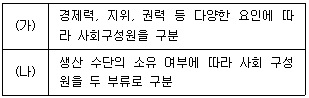 [과목 구분 없음] 다음은 사회 계층화 현상에 관한 개념이다. (가), (나)에 대한 설명으로 옳은 것은?