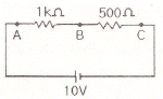 그림과 같은 회로에서 내부저항 1kΩ인 전압계로 단자 A, B간의 전압을 측정하면 몇 [V]인가?