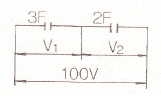 그림과 같이 콘덴서 3F와 2F가 직렬로 접속된 회로에 전압 100V를 가하였을 때 3F 콘덴서의 단자전압 V1은?