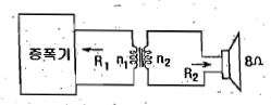 그림과 같은 오디오회로에서 스피커 저항이 8Ω이고, 증폭기 회로의 저항이 288Ω이다. 이 변압기의 권수비는?