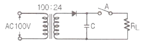 그림과 같은 반파정류회로에 스위치 A를 사용하여 부하 저항 RL 을 떼어 냈을 경우, 콘덴서 C의 충전전압[V]은?