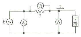 [소방전기회로] 그림과 같이 전압계 V1, V2, V3와 5Ω의 저항 R을 접속하였다. 전압계의 지시가 V1=20V, V2=40V, V3=50V 라면 부하전력은 몇 W인가?