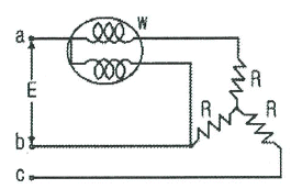 선간전압 E[V]의 3상 평형전원에 대칠 3상 저항부하 R[Ω]이 그림과 같이 접속되었을 때 a, b 두 상간에 접속된 전력계의 지시값이 W[W]라면 C상의 전류는 몇 A 인가?
