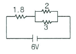 그림과 같은 회로에서 2Ω에 흐르는 전류는 몇 A인가? (단, 저항의 단위는 모두 Ω이다.)