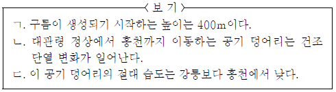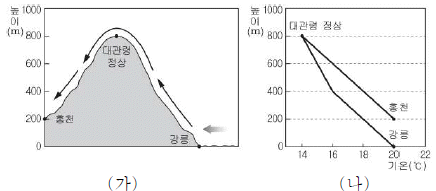 그림 (가)는 어느 공기 덩어리가 강릉에서 홍천으로 산을 넘어가는 모습을, (나)는 이 때 공기 덩어리의 기온 변화를 나타낸 것이다.