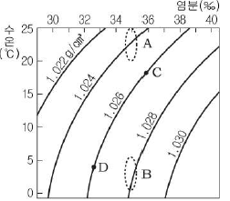 그림은 수온-염분도에 염분이 비슷한 두 해역의 해수 A, B와 밀도가 같은 두 해수 C, D를 나타낸 것이다.
