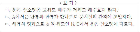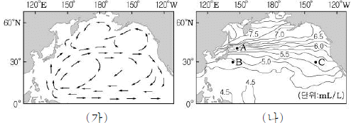 그림 (가)는 북태평양 해수의 표층 순환을, (나)는 표층 해수의 용존 산소량 분포를 나타낸 것이다.