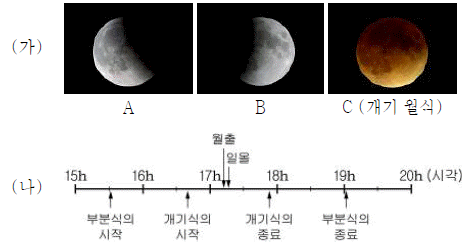 그림 (가)는 우리나라에서 과거에 관측한 월식 사진 A~C를 순서 없이 나열한 것이고, (나)는 앞으로 일어날 어느 월식의 시간표이다.