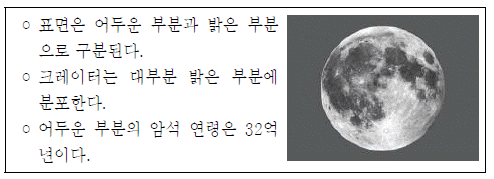 다음은 천체 망원경으로 관측한 달의 모습과 표면의 특징을 조사하여 정리한 것이다.