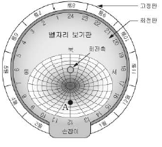 어느 날 18시의 별자리를 알아보기 위해 별자리 보기판의 손잡이를 돌려 날짜와 시각을 맞추었더니 별 A의 위치가 그림과 같았다.