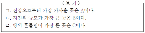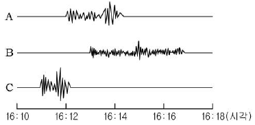 그림은 어느 지진이 발생했을 때 서로 다른 관측소 A, B, C에 기록된 지진파의 모습이다.
