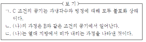 그림 (가)는 포화 수증기압 곡선에 서로 다른 조건의 공기 A~C를 나타낸 것이고, (나)는 구름 속에서 빙정이 성장하는 과정을 나타낸 것이다.