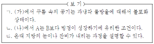 그림 (가)는 과냉각 물방울과 빙정이 섞여 있는 구름 속에서 빙정이 성장하는 과정을, (나)는 온도에 따른 빙정과 과냉각 물방울의 포화 수증기압을 나타낸 것이다.