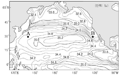 그림은 북태평양의 표층 염분 분포를 나타낸 것이다.