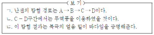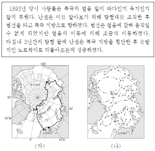 다음은 난센의 북극 탐험을 서술한 것이고, 그림 (가)는 난센의 탐험 경로를, (나)는 북극 주변에 흐르는 해류를 나타낸 것이다.