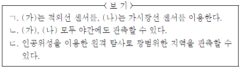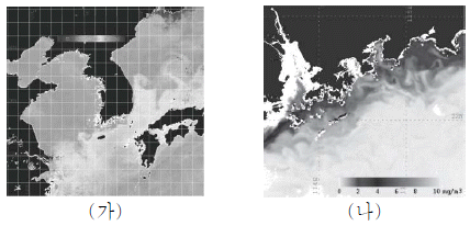 그림 (가)는 어느 인공위성을 이용하여 관측한 수온 분포를, (나)는 적조 분포를 나타낸 것이다.