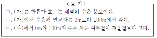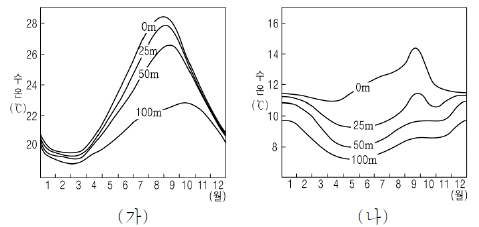 그림 (가), (나)는 북태평양의 난류와 한류가 흐르는 중위도 해역에서 1년 동안 깊이에 따른 수온 분포를 순서없이 나타낸 것이다.