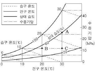 그림은 공기의 건구온도와 습구 온도에 따른 상대 습도와 수증기압을 나타낸 것이다.