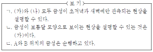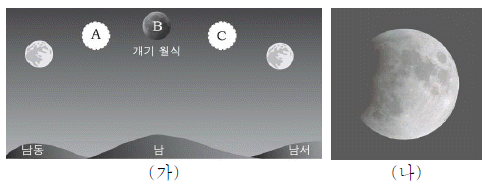 그림 (가)는 북반구 어느 지역에서 관측한 월식 과정을 나타낸 것이고, (나)는 이날 관측한 달의 모습 중 하나이다.