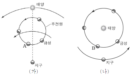 그림 (가), (나)는 서로 다른 우주관에서 태양, 금성, 지구의 위치 변화를 나타낸 것이다.