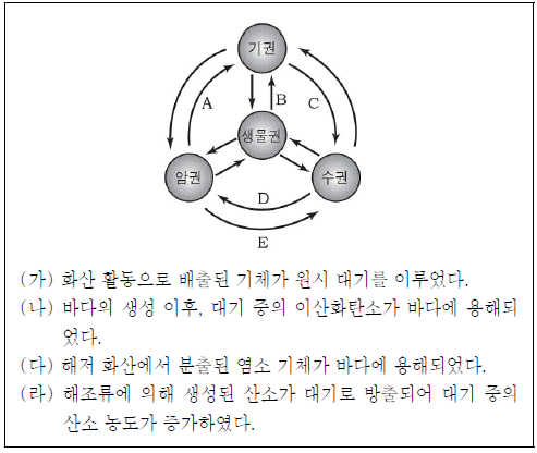 다음은 지구 환경 구성 요소 간의 상호 작용과 지구의 진화 과정에서 일어난 현상 (가) ~(라)를 나타낸 것이다.