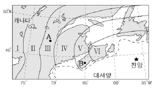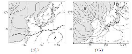 그림(가), (나)는 어느 해 우리나라 주변의 여름철과 겨울철 일기도를 순서 없이 나타낸 것이다.