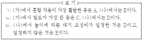 그림 (가)는 깊이에 따른 해수의 수온 분포를, (나)는 높이에 따른 대기의 평균 분자량의 분포를 나타낸 것이다.