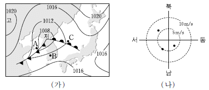 그림 (가)는 어느 날 우리나라 주변의 지상 일기도이고, (나)는 이때 A, B, C 지점의 풍향과 풍속을 점(•)으로 나타낸 것이다.