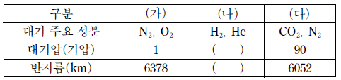 그림 (가), (나), (다)는 금성, 지구, 화성의 연직 기온 분포를 순서 없이 나타낸 것이다.